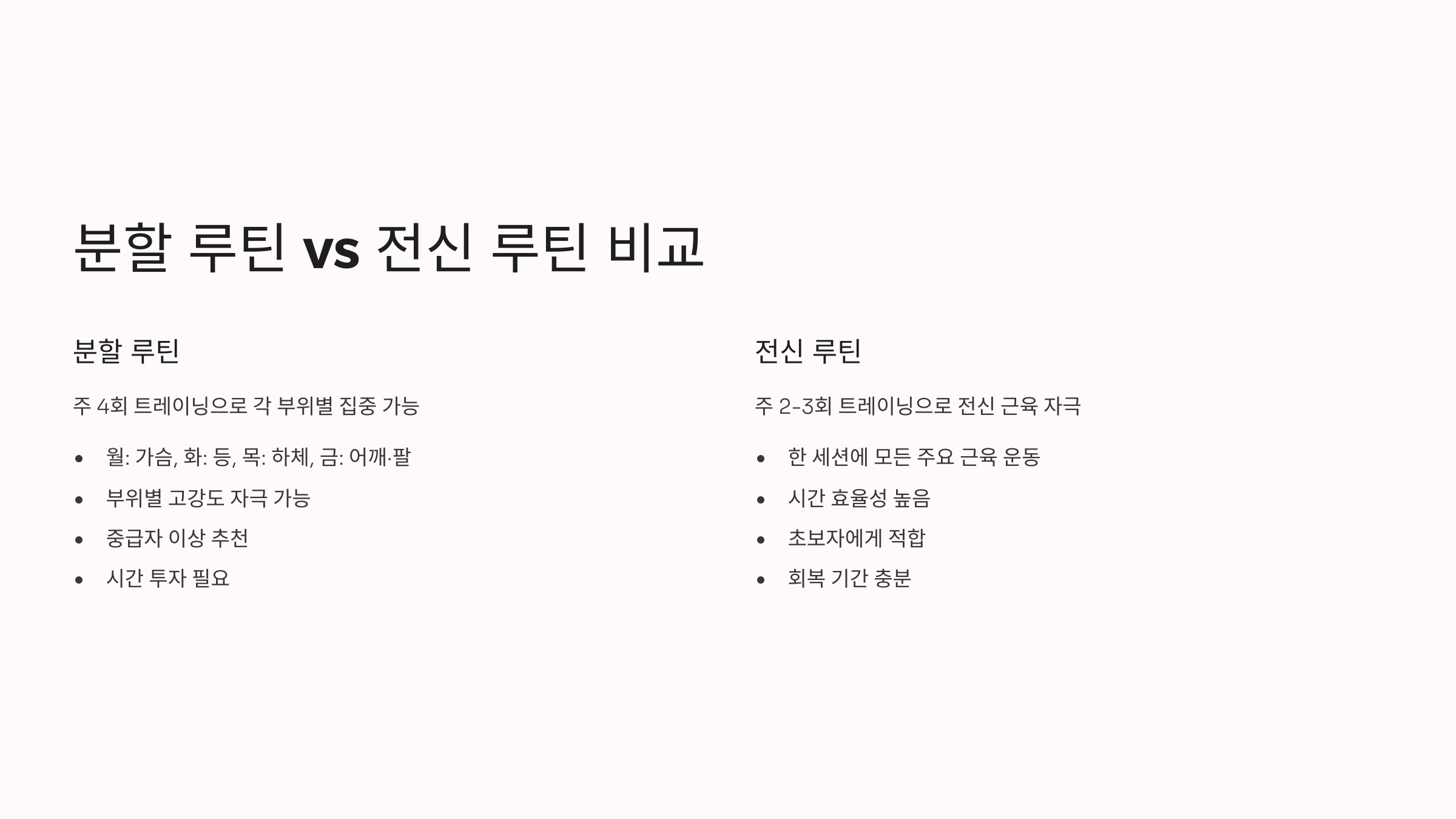 | 구분 | 전신 루틴 | 분할 루틴 |