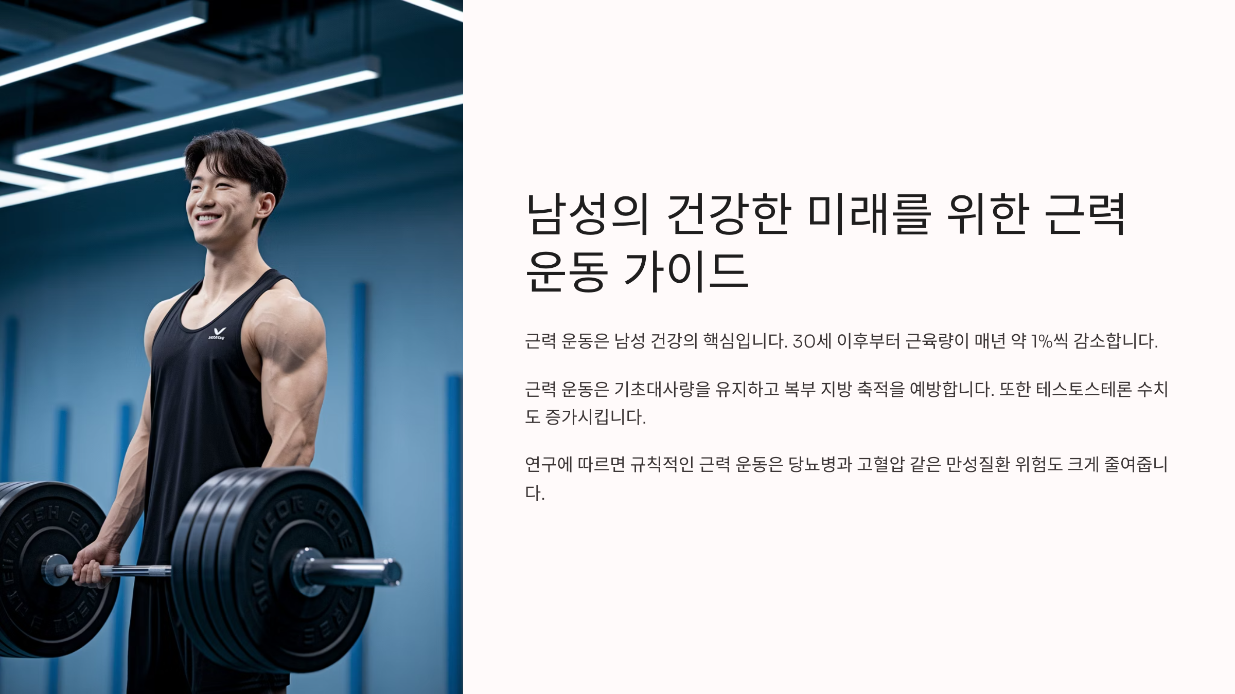 🏋️♂️ 남성에게 근력운동은 단지 외형적인 근육을 만드는 것을 넘어, 전반적인 건강과 자존감을 향상시키는 필수 루틴이에요. 근육량이 많을수록 대사량이 높아지고, 생활의 활력도 자연스럽게 올라가죠.